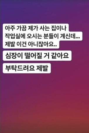 El 26 de marzo KST, el rapero y estrella de variedades publicó una historia de Instagram a través de su cuenta personal y escribió: «Hay personas que vienen a mi lugar de residencia y a mi estudio con bastante frecuencia… Por favor, no hagas eso. Me siento como si mi corazón fuera a latir con fuerza. Te lo pido. Por favor».