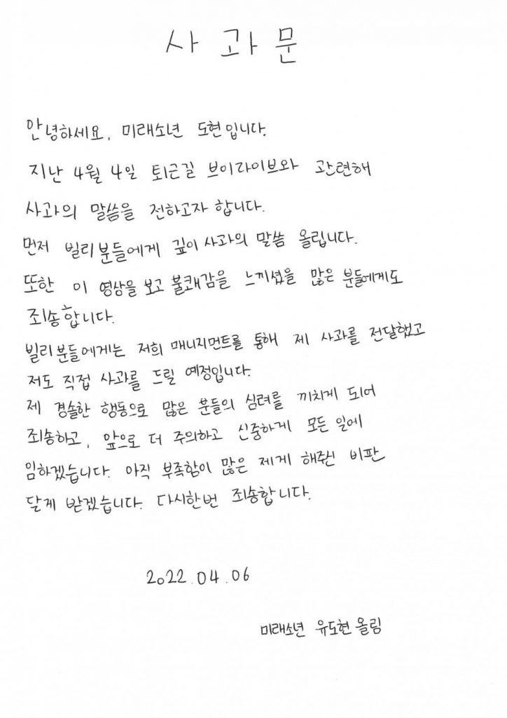 Dohyun luego publicó una carta de disculpa escrita a mano en el Twitter de MIRAE. El escribio: