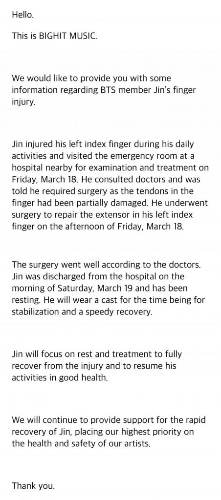 El 18 de marzo, Big Hit Music publicó una declaración oficial, revelando que Jin de BTS se está recuperando después de someterse a una cirugía en un dedo lesionado.
