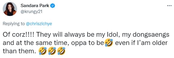 Antes del lanzamiento de «Still Life», nuestra ~presidenta~ VIP, Sandara Park, se entusiasmó con el regreso de BIGBANG cuando respondió a la pregunta de un fanático. Dijo que los chicos siempre serán sus ídolos, dongsaengs (hermanos menores) y futuros oppa.