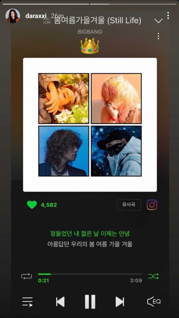 Temprano esta mañana, Dara subió una captura de pantalla de la canción en su historia de IG. Minzy, miembro de 2NE1, también promocionó «Still Life» en su Instagram.