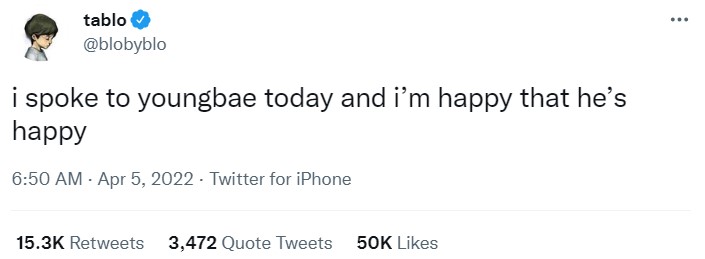 Tablo, quien solía trabajar con BIGBANG en YG Entertainment, escribió un tweet para sentirse bien en Twitter. Compartió que habló con Taeyang (a quien cariñosamente llama por su nombre real, Youngbae) y está feliz de ser feliz. BRB, llorando.