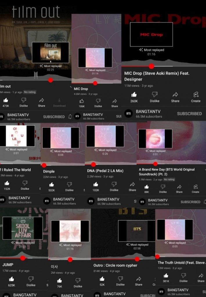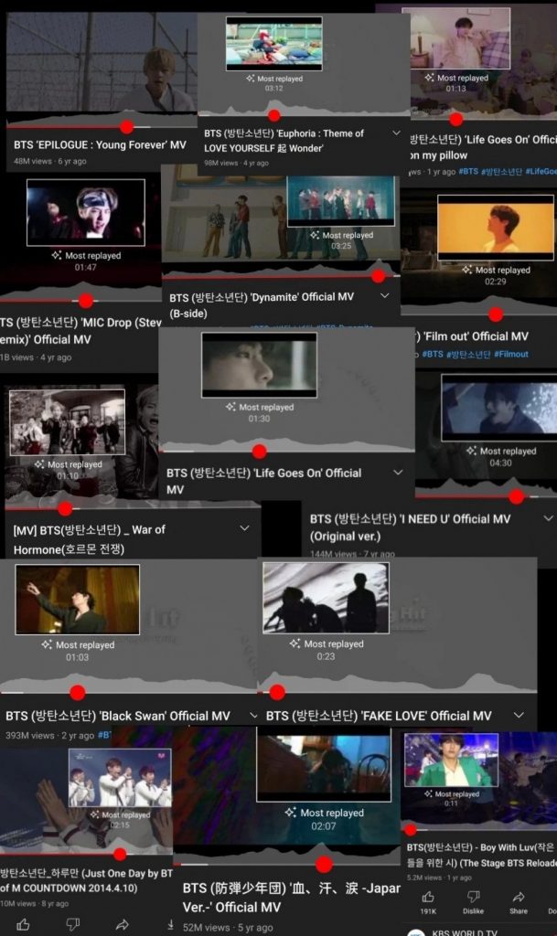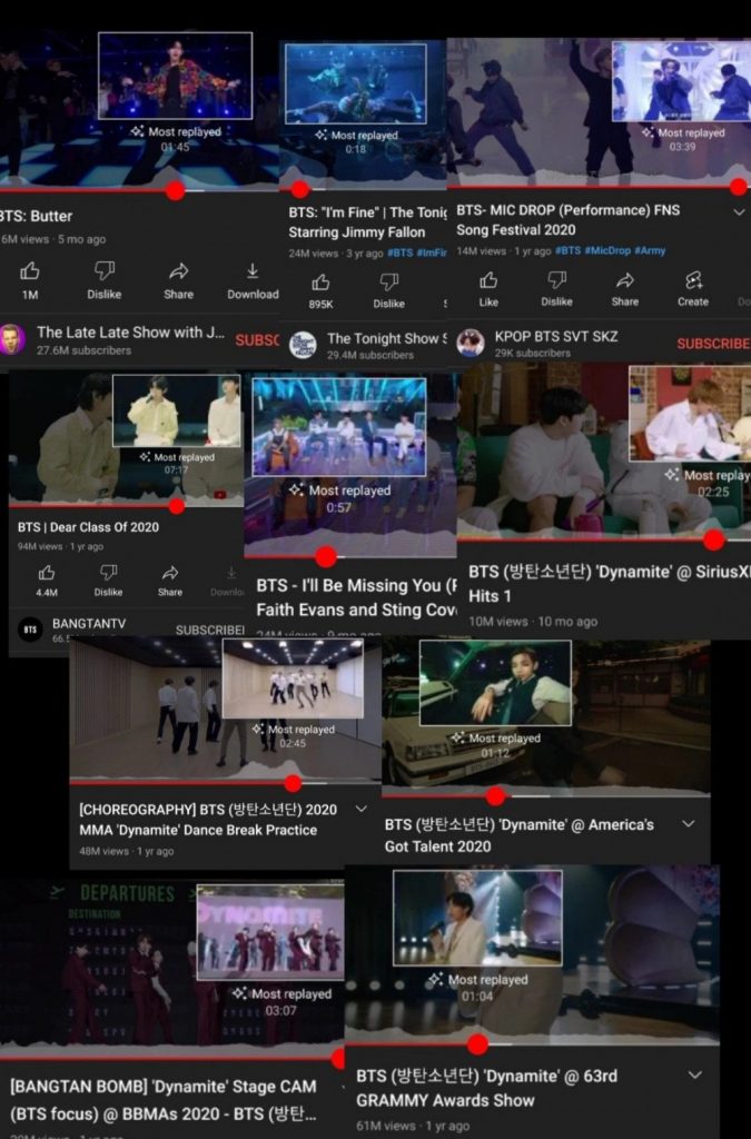 YouTube ha lanzado una nueva función que destaca las partes «más reproducidas» de los videos, y se reveló que las escenas de V son las más vistas entre muchos videos musicales, actuaciones y audios de BTS.